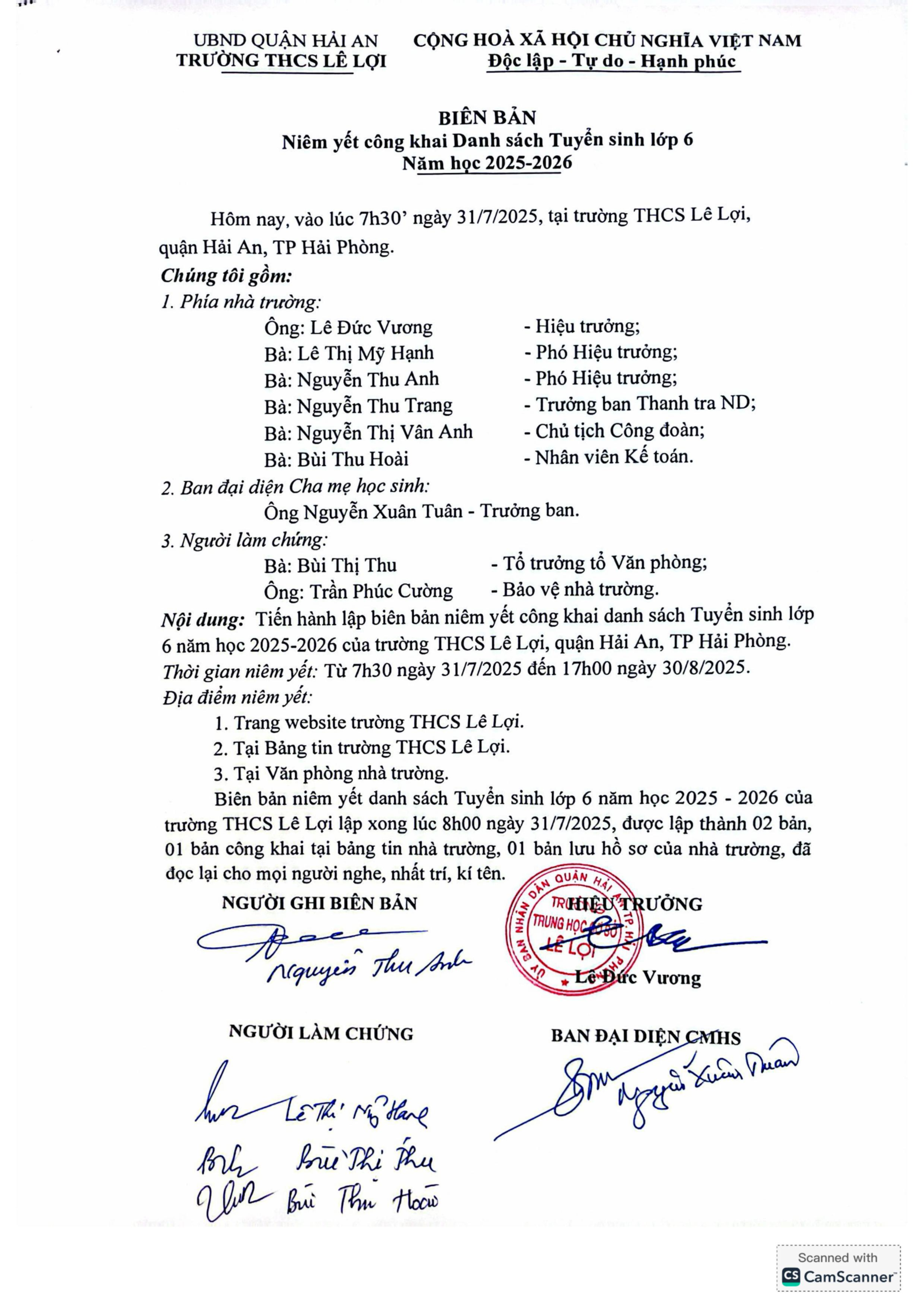 Biên bản niêm yết công khai danh sách tuyển sinh lớp 6 trường THCS Lê Lợi năm học 2025-2026