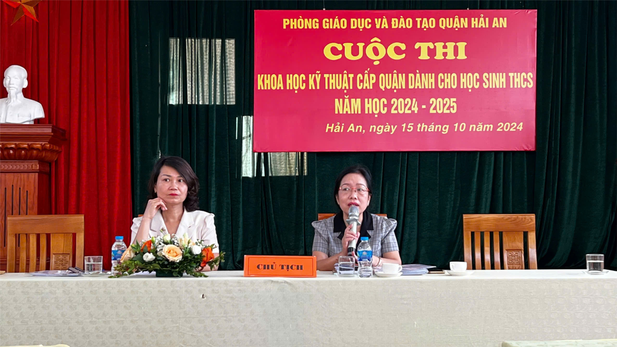 Thực hiện kế hoạch năm học 2024-2025,  ngày 15/10/2024, Phòng GD&ĐT quận Hải An tổ chức cuộc thi KHKT dành cho học sinh THCS cấp quận năm học 2024-2025 tại trường THCS Lê Lợi. Đến dự buổi lễ có đ/c Nguyễn Thị Minh Thu - Trưởng Phòng GD & ĐT quận Hải An, đ/c Vũ Thị Như Mai - Phó Trưởng phòng GD & ĐT quận Hai An; các đ/c chuyên viên phòng GD&ĐT quận Hải An, BGH các trường THCS, giáo viên hướng dẫn, học sinh có dự án tham gia và Ban giám khảo là cốt cán Hội đồng bộ môn quận.