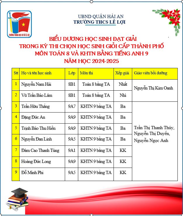 Với kết quả đạt được, một lần nữa Trường THCS Lê Lợi tiếp tục khẳng định vị trí dẫn đầu Quận Hải An về chất lượng đào tạo học sinh giỏi.