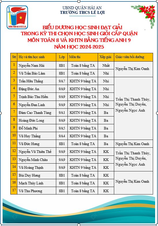 Những ngày giáp Tết Ất Tỵ, thầy và trò Trường THCS Lê Lợi liên tiếp đón nhận những tin vui, tại kỳ thi chọn HSG cấp Quận do phòng GD & ĐT tổ chức vừa qua dành cho hoc sinh môn toán lớp 8 và KHTN lớp 9 bằng Tiếng Anh của các trường THCS trên địa bàn Quận Hải An. Đội tuyển HSG của trường chúng ta đã xuất sắc giành được 17 giải, trong đó có: