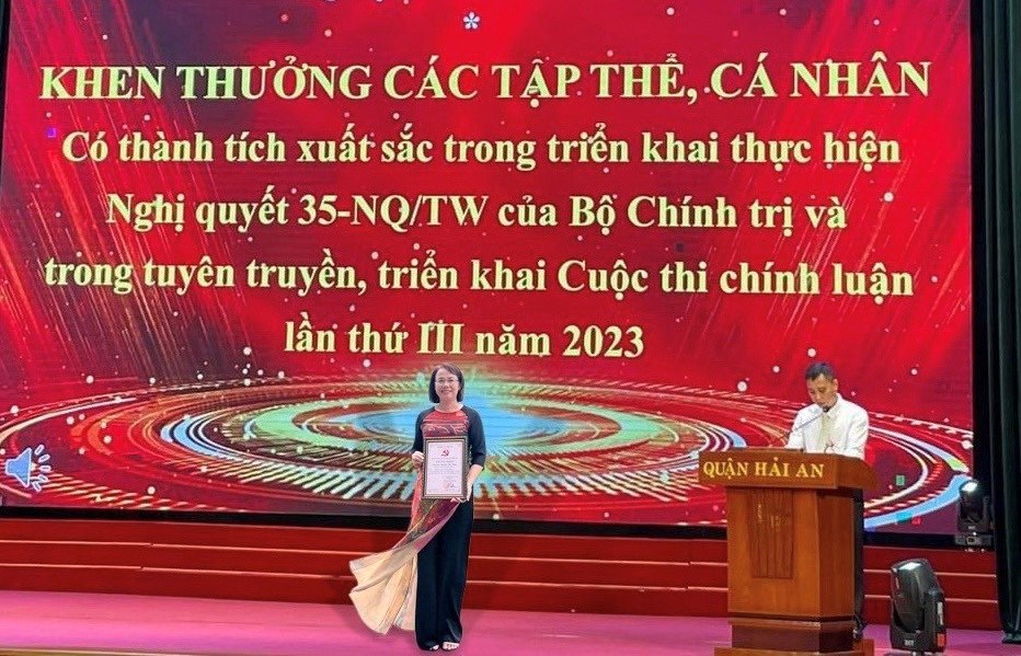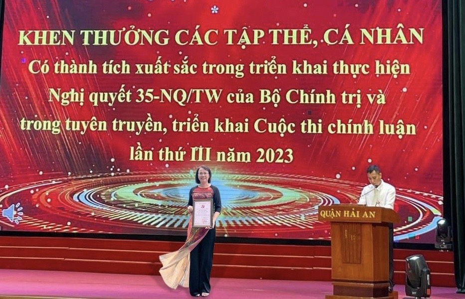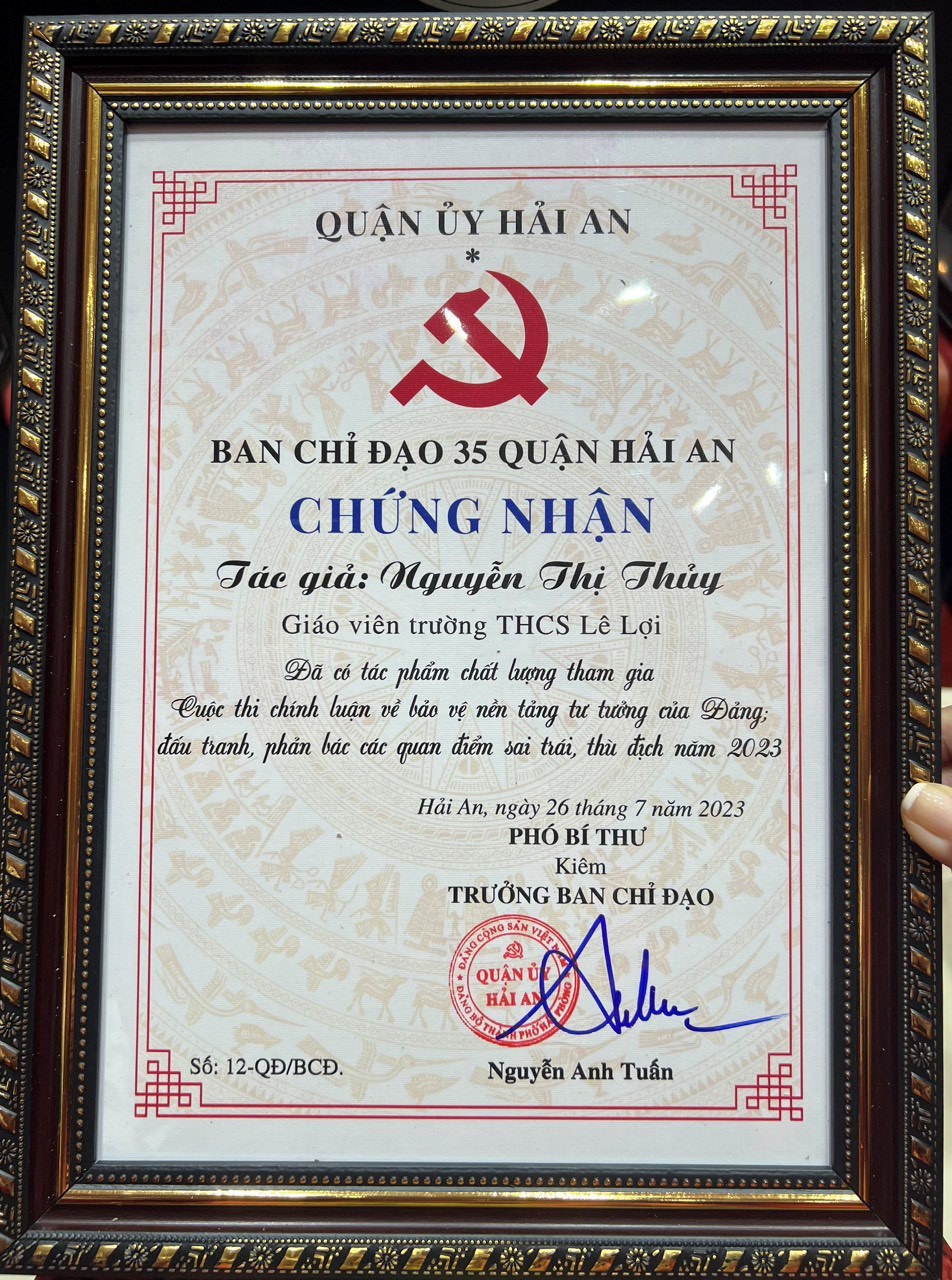 Chúc mừng đồng chí Nguyễn Thị Thủy, Tổ trưởng tổ KHXH của Trường THCS Lê Lợi, quận Hải An vinh dự được Ban chỉ đạo 35 Quận Ủy Hải An biểu dương cá nhân có thành tích xuất sắc trong hưởng ứng, triển khai tham gia cuộc thi chính luận về bảo vệ nền tảng tư tưởng của Đảng, đấu tranh phản bác các quan điểm sai trái, thù địch năm 2023 trên địa bàn quận Hải An