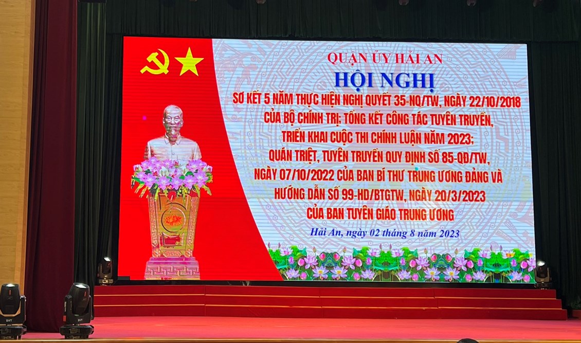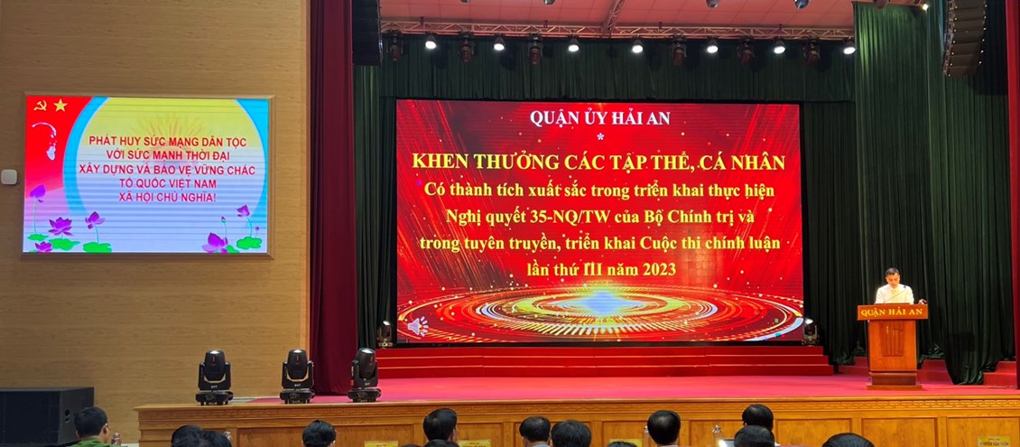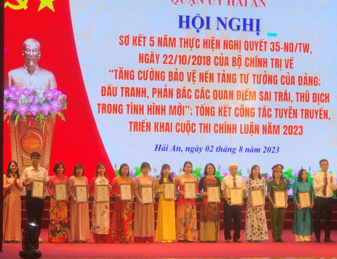Sáng ngày 02/8/2023, tại Hội trường Trung tâm, Ban Thường vụ Quận ủy Hải An tổ chức Hội nghị sơ kết 05 năm thực hiện Nghị quyết 35-NQ/TW của Bộ Chính trị; Tổng kết Cuộc thi Chính luận về “Bảo vệ nền tảng tư tưởng của Đảng, đấu tranh, phản bác các quan điểm sai trái, thù địch” năm 2023 và quán triệt, tuyên truyền Quy định số 85-QĐ/TW ngày 07/10/2022 của Ban Bí thư, Hướng dẫn số 99-HD/BTGTW ngày 20/3/2023 của Ban Tuyên giáo Trung ương về việc cán bộ, đảng viên thiết lập và sử dụng trang thông tin điện tử cá nhân trên Internet, mạng xã hội. Đồng chí Nguyễn Thị Thủy, Tổ trưởng tổ KHXH của Trường THCS Lê Lợi, quận Hải An vinh dự được Ban chỉ đạo 35 Quận Ủy Hải An biểu dương cá nhân có thành tích xuất sắc trong hưởng ứng, triển khai tham gia cuộc thi chính luận về bảo vệ nền tảng tư tưởng của Đảng, đấu tranh phản bác các quan điểm sai trái, thù địch năm 2023 trên địa bàn quận Hải An theo Quyết định số 12- QĐ/BCĐ, ngày 24 tháng 7 năm 2023 của Quận Ủy Hải An.