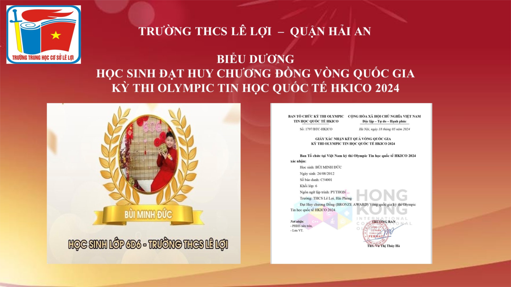 Chúc mừng em Bùi Minh Đức - học sinh lớp 6D6 đã có phần thể hiện xuất sắc trong kỳ thi HKICO - Olympic Tin học quốc tế và giành được giải Đồng tại vòng quốc gia.