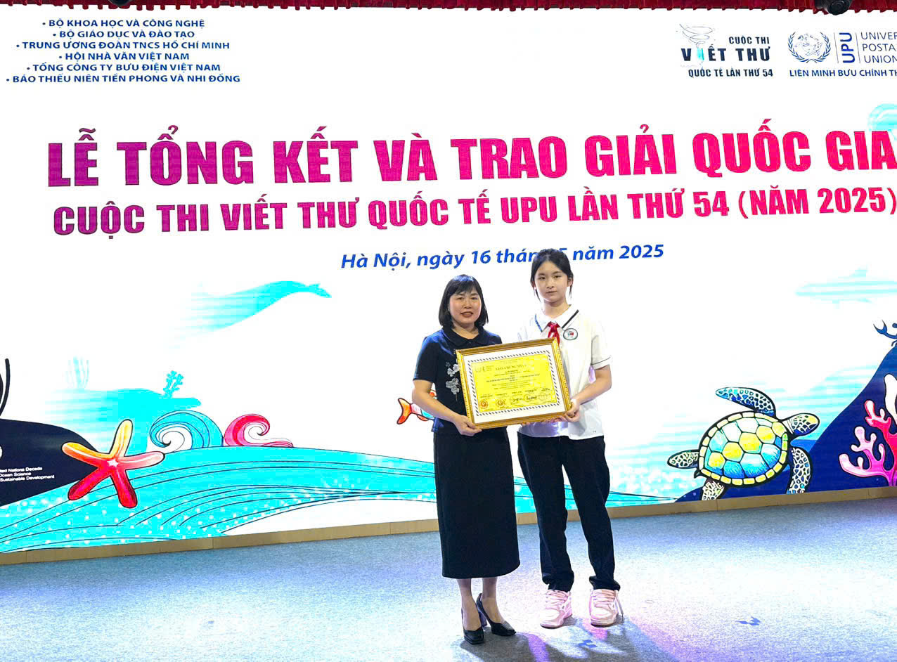 Chúc mừng em Đỗ Minh Hà - Học sinh lớp 8B12 Trường THCS Lê Lợi đạt giải Ba Quốc gia kỳ thi viết thư Quốc tế UPU lần thứ 54- năm 2025