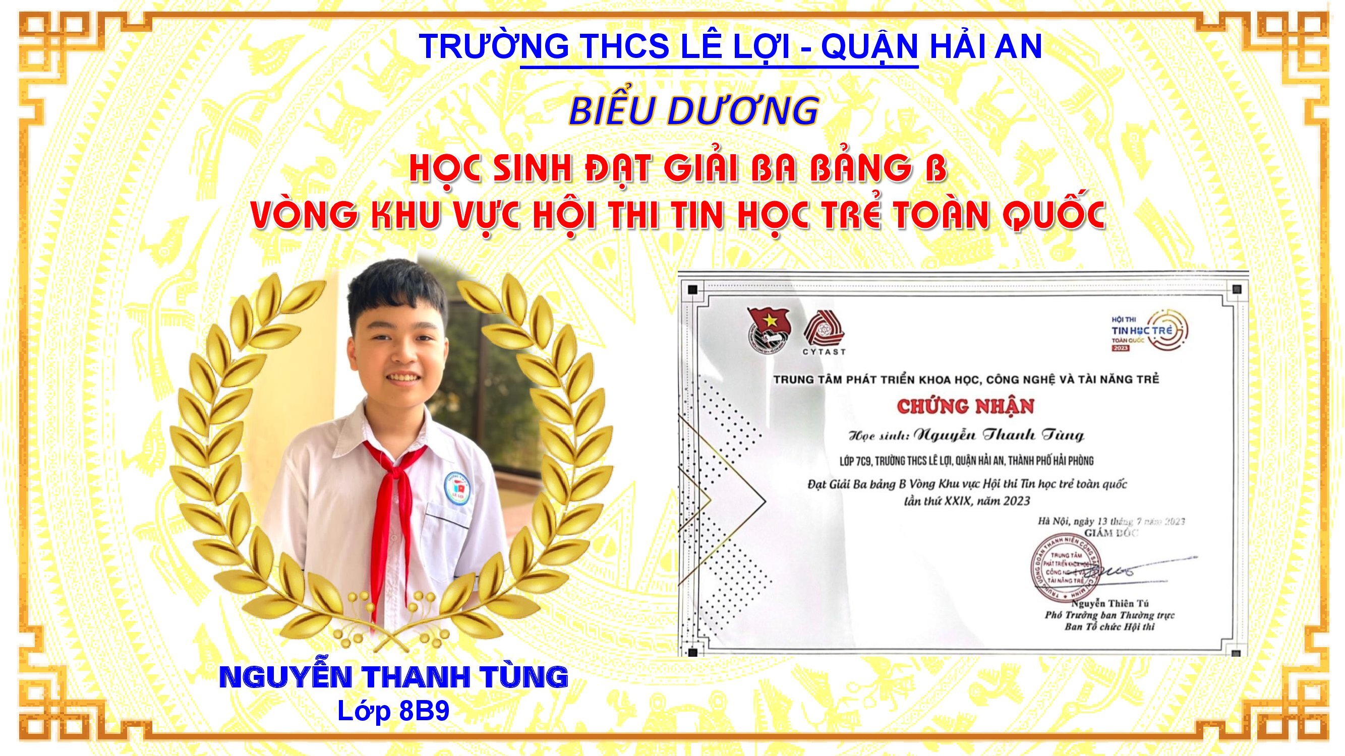 Trường THCS Lê Lợi, Quận Hải An chúc mừng em Nguyễn Thanh Tùng- Lớp 8B9 đạt giải Ba bảng B Vòng khu vực Hội thi Tin học trẻ toàn quốc lần thứ XXIX năm 2023. Nhà trường, thầy cô và bạn bè luôn tự hào về em. Chúc em tiếp tục phát huy năng lực bản thân, gặt hái được nhiều thành công và luôn là tấm gương sáng để các bạn học tập và noi theo.