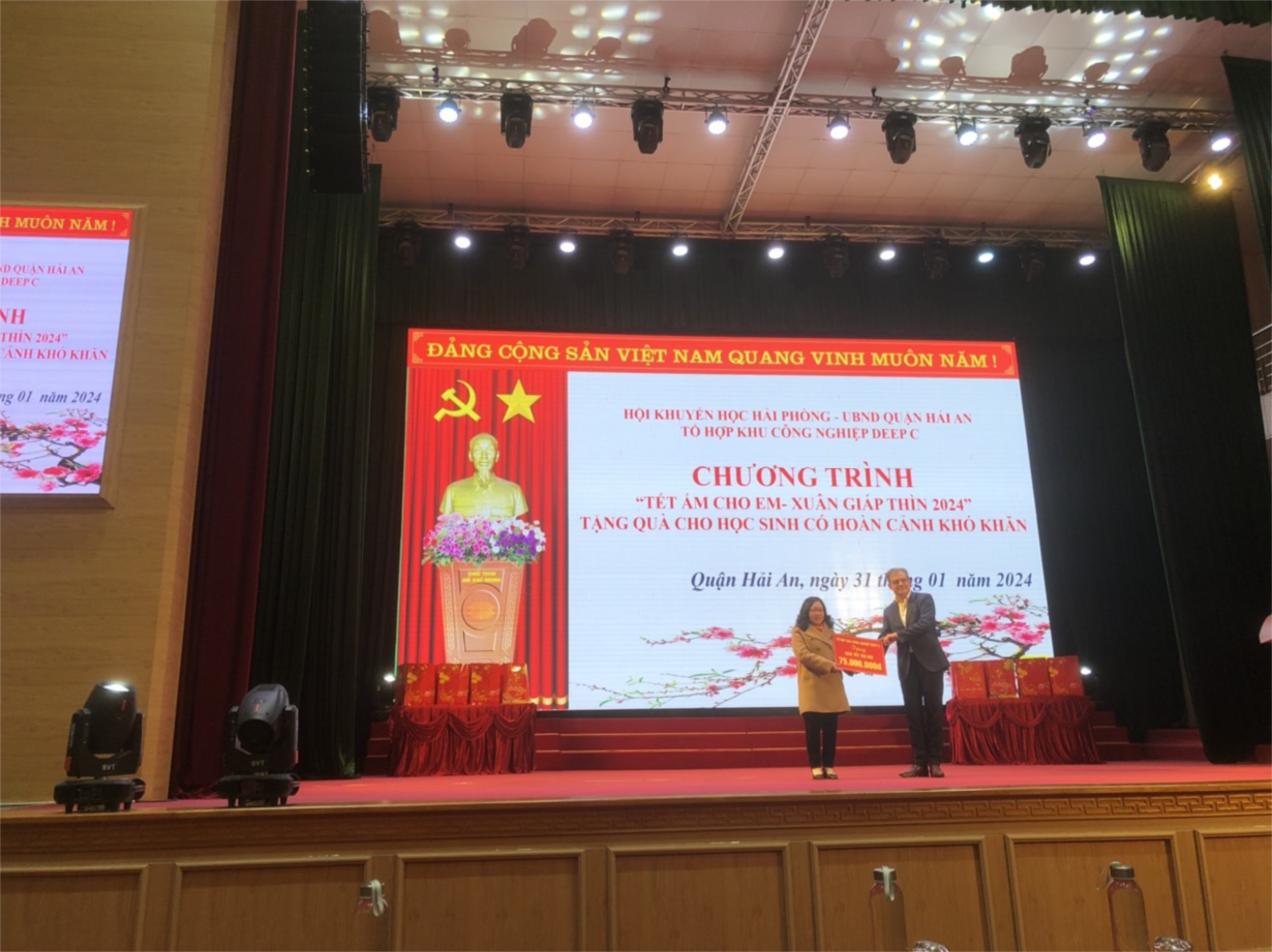 Chiều 31/1, Tại Hội trường UBND quận Hải An, Hội Khuyến học thành phố phối hợp với UBND quận Hải An – Tổ hợp khu công nghiệp DEEPC  tổ chức chương trình “Tết ấm áp cho em – xuân giáp thìn 2024” tặng quà cho học sinh có hoàn cảnh khó khăn cho học sinh có hoàn cảnh đặc biệt khó khăn trên địa bàn quận Hải An. Trong đó trường THCS Lê Lợi có 15 học sinh được nhận quà do Hội khuyến học trao tặng