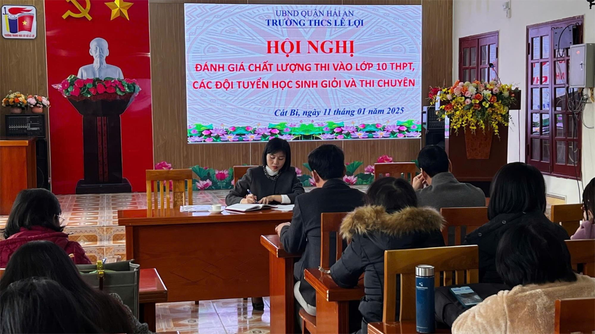 Thực hiện kế hoạch năm học 2024-2025, ngày 11/01/2025, tại Trường THCS Lê Lợi, Phòng Giáo dục và Đào tạo quận Hải An tổ chức Hội nghị đánh giá chất lượng chất lượng tuyển sinh vào lớp 10 THPT, các đội tuyển HSG và thi chuyên năm học 2024-2025