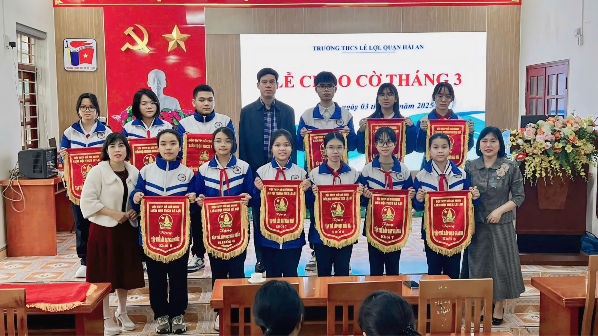 Sáng ngày 03/3/2025, Trường THCS Lê Lợi, quận Hải An tổ chức lễ chào cờ tháng 03. Tham dự buổi lễ có các thầy cô giáo trong BGH Nhà trường, cô Tổng phụ trách, các thầy cô giáo, các em học sinh đại diện các lớp và các gương mặt học sinh tiêu biểu được khen thưởng, biểu dương.