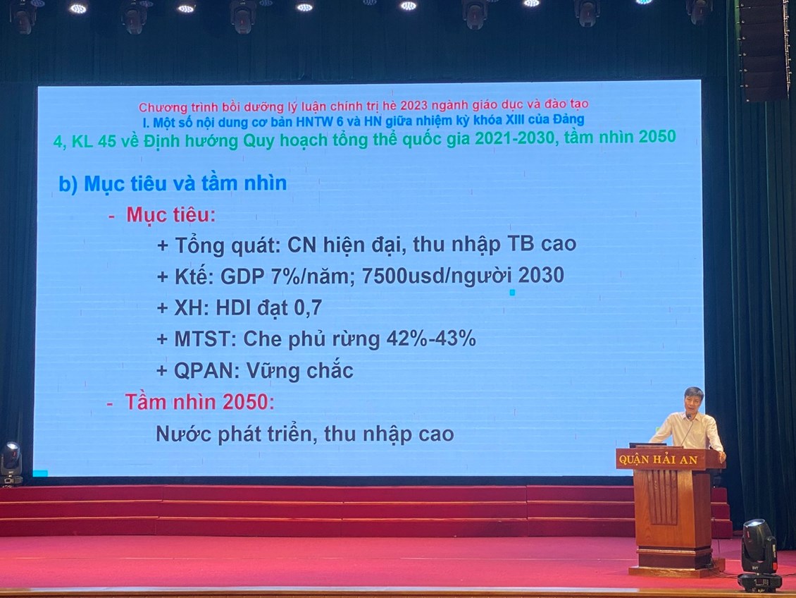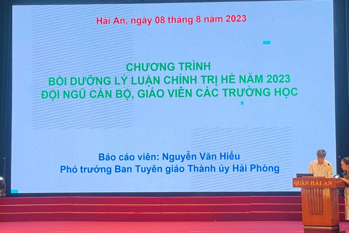 Thực hiện Công văn số 22-KH/BTGQU-PGD&ĐT, ngày 18/7/2023 của Ban tuyên giáo Quận ủy- Phòng Giáo dục và Đào tạo về việc tham gia lớp bồi dưỡng chính trị hè cho đội ngũ cán bộ, giáo viên các trường Trung học cơ sở thuộc quận Hải An năm 2023. Sáng ngày 08-8-2023, cán bộ, giáo viên, nhân viên trường THCS Lê Lợi Quận Hải An nghiêm túc tham gia học tập với tinh thần nâng cao nhận thức chính trị, tư tưởng, ý thức trách nhiệm, năng lực thực hiện nhiệm vụ đáp ứng yêu cầu đổi mới giáo dục theo Chương trình phổ thông 2018. Dưới sự giảng dạy của thầy Nguyễn Văn Hiểu- Phó trưởng Ban Tuyên giáo Thành ủy Hải Phòng, các đồng chí cán bộ, giáo viên và nhân viên trường THCS Lê Lợi, quận Hải An đã cập nhật được các thông tin, kiến thức mới, phục vụ cho công tác quản lý và giảng dạy tại địa phương. Sau đây là một số hình ảnh: