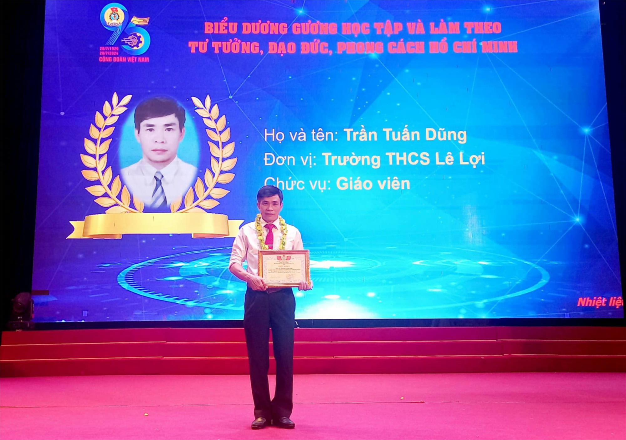 Thầy giáo Trần Tuấn Dũng - GV Trường THCS Lê Lợi được tặng giấy khen tại Hội nghị Biểu dương lao động giỏi, lao động sáng tạo, cán bộ công đoàn tiêu biểu năm 2023, gương học tập và làm theo tư tưởng, đạo đức, phong cách Hồ Chí Minh giai đoạn 2021-2024.