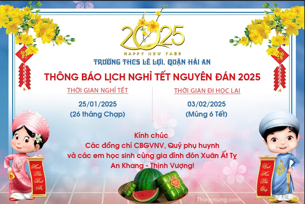 Trường THCS Lê Lợi trân trọng thông báo lịch nghỉ Tết Nguyên Đán Ất Tỵ như sau: