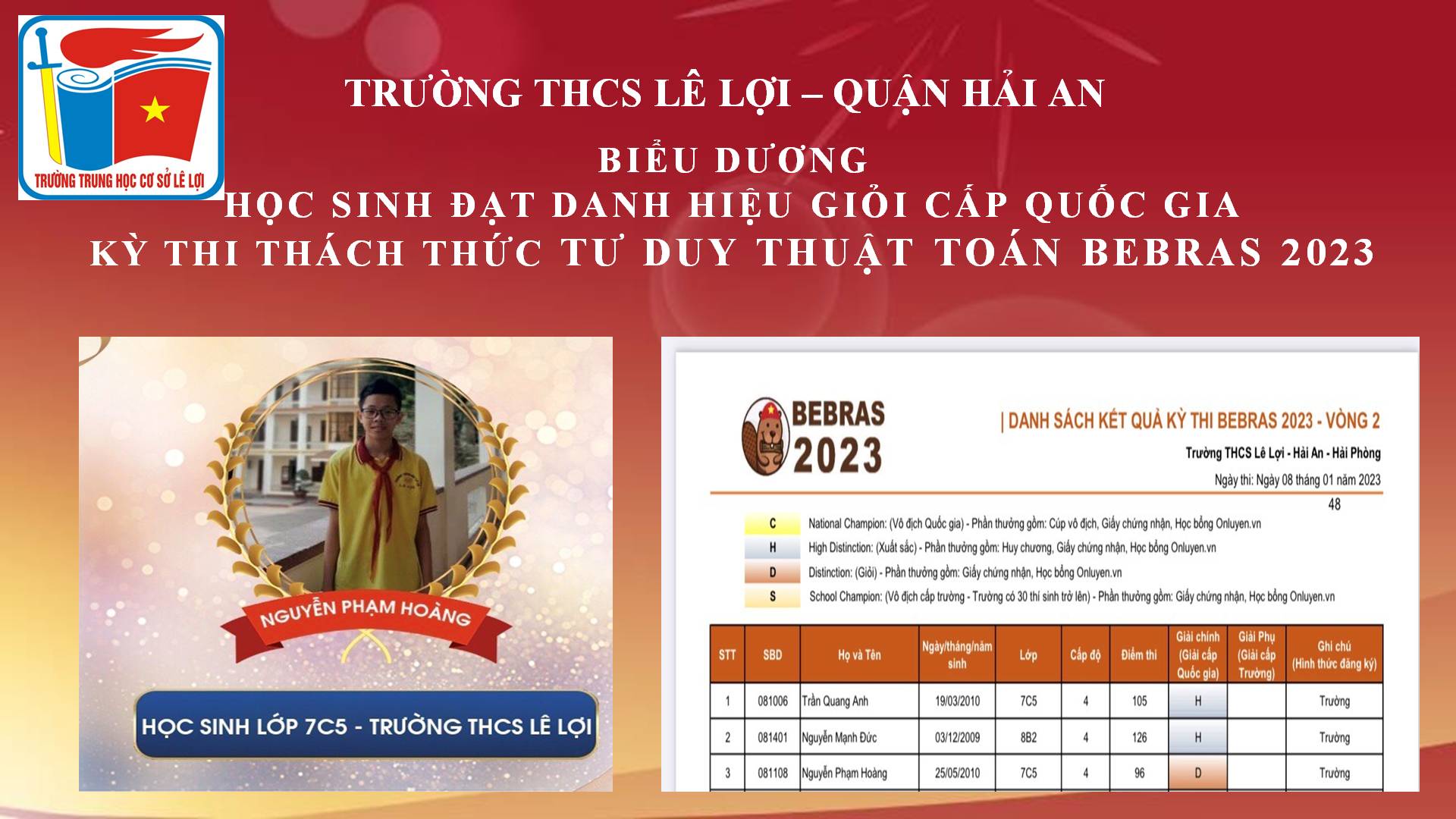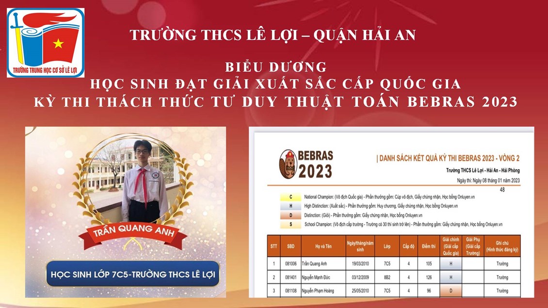 Kỳ thi Thách thức tư duy thuật toán Bebras là một sân chơi dành cho học sinh trên cả nước có cơ hội tham gia một kỳ thi chuẩn Quốc tế. Học sinh tham gia sẽ được trải nghiệm và vượt qua các thử thách thú vị, được lồng ghép khéo léo từ chính những bài học đơn giản trong cuộc sống. Tham gia kỳ thi lần này các em học sinh trường THCS Lê Lợi đã xuất sắc mang về 2 giải Xuất sắc và 01 danh hiệu Giỏi cấp Quốc gia. Chúc mừng thành tích đạt được của các em!