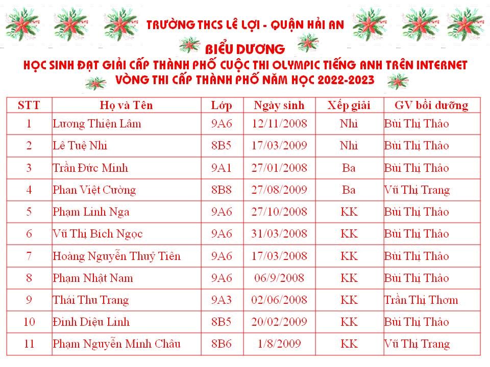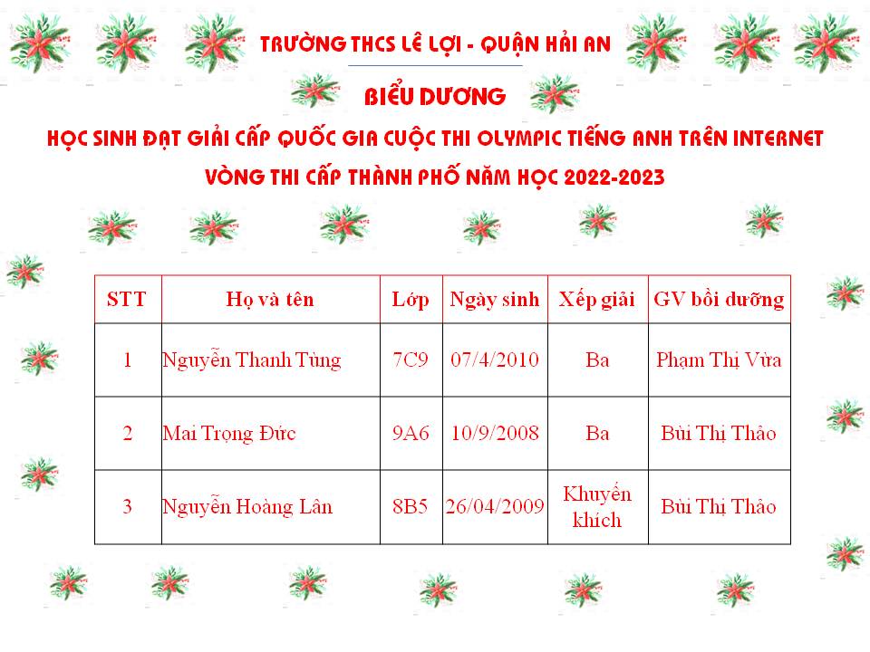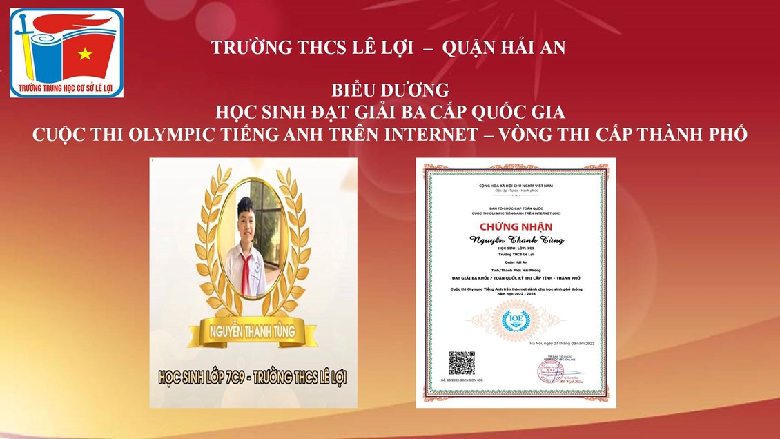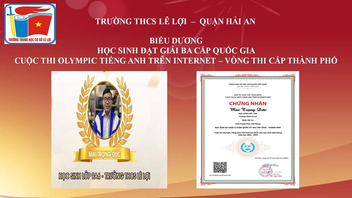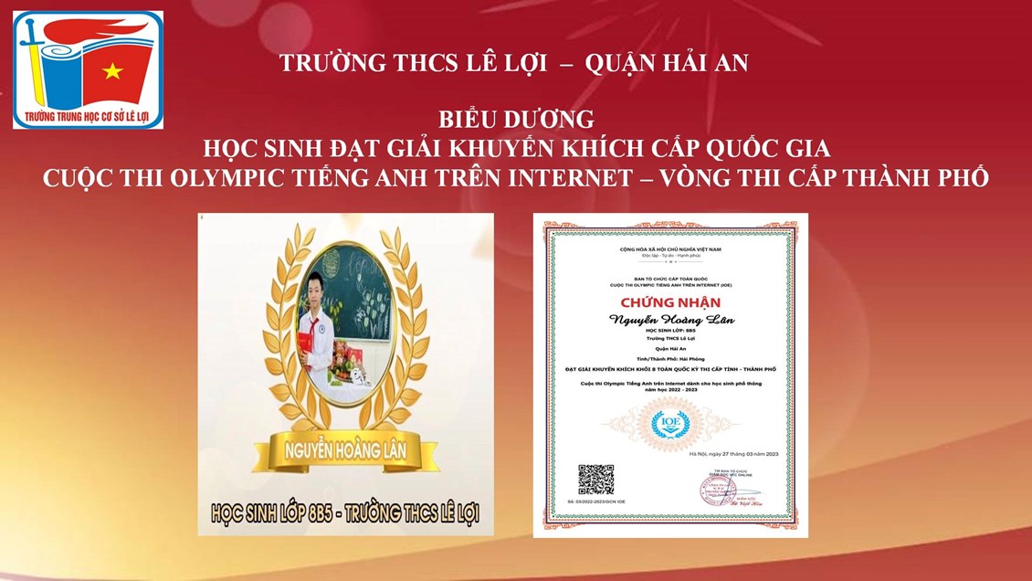 Trường THCS Lê Lợi quận Hải An chúc mừng các em học sinh đạt thành tích cao trong cuộc thi Olympic Tiếng Anh trên Internet - Vòng thi cấp Thành phố. Trong kỳ thi này, trường THCS Lê Lợi có 03 học sinh được vinh danh cấp Quốc gia, 11 học sinh được vinh danh cấp thành phố. Chúc các em tiếp tục bồi dưỡng, rèn luyện và đạt kết quả cao nhất trong vòng thi cấp Quốc gia sắp tới.