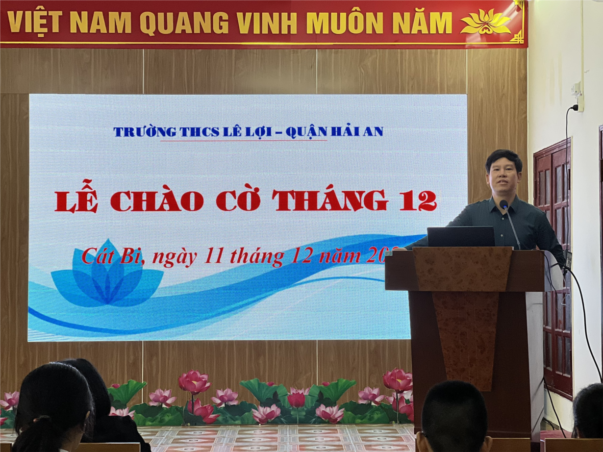 Ngày 11/12/2023, trường THCS Lê Lợi đã tiến hành chào cờ đầu tháng 12 nhằm tổng kết các hoạt động công tác Đội trong tháng 11 và triển khai kế hoạch công tác Đội tháng 12/2023.