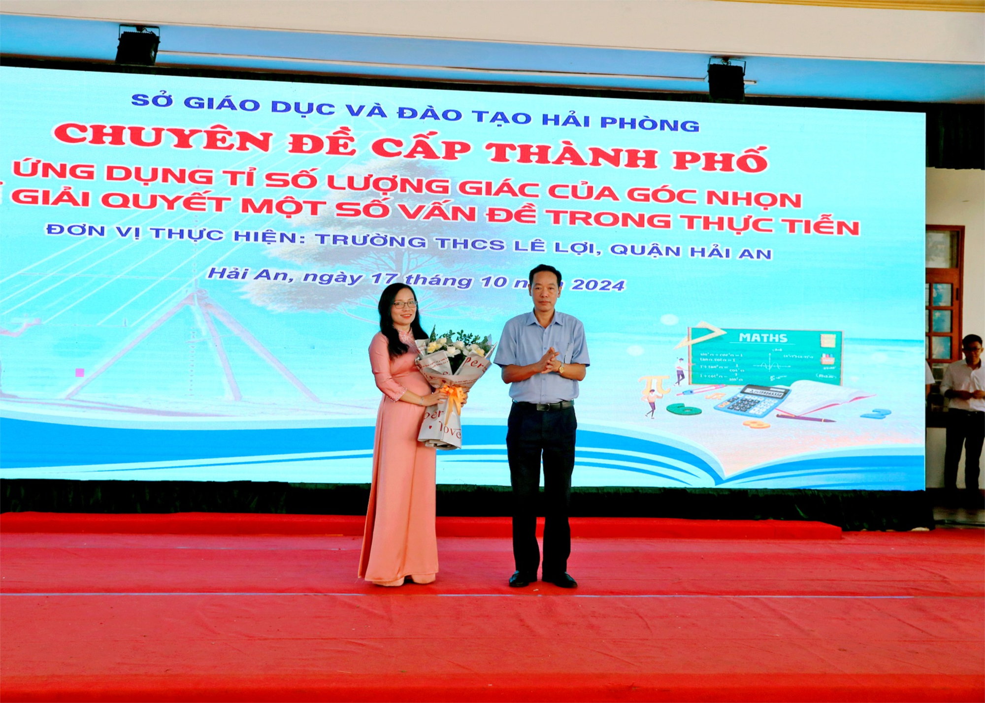 Thực hiện Công văn số 2474/SGDĐT-GDTrH ngày 16/8/2024 của Sở Giáo dục và Đào tạo (GDĐT) Hải Phòng về việc Hướng dẫn thực hiện nhiệm vụ Giáo dục trung học năm học 2024-2025, Kế hoạch số 221/KH-UBND ngày 20 tháng 8 năm 2024 của Ủy ban nhân dân quận Hải An triển khai Kế hoạch công tác Giáo dục - Đào tạo năm học 2024 – 2025; nhằm tiếp tục thực hiện tốt Chương trình Giáo dục phổ thông 2018; sáng 17/10/ 2024, trường THCS Lê Lợi long trọng tổ chức Chuyên đề cấp thành phố môn toán lớp 9 với chủ đề: Ứng dụng tỉ số lượng giác của góc nhọn để giải quyết một số vấn đề trong thực tiễn, ” là đơn vị kiến thức trong chương IV- Hệ thức lượng trong tam giác vuông của chương trình sách giáo khoa Toán 9 bộ sách Cánh diều.