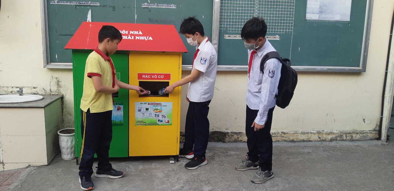 Trường THCS Lê Lợi đã trang bị hệ thống thùng rác phân loại tương ứng với 2 loại rác thải: