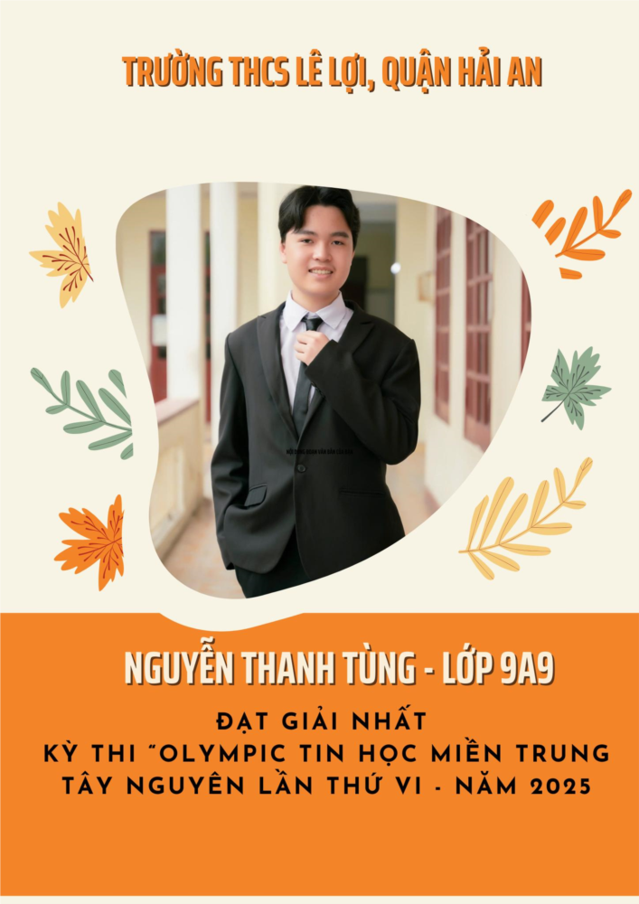 Trường THCS Lê Lợi vô cùng tự hào và vui mừng khi em Nguyễn Thanh Tùng, học sinh lớp 9A9 đã xuất sắc giành Giải Nhất tại Kỳ thi Olympic Tin học miền Trung – Tây Nguyên lần thứ VI năm 2025, bảng dành cho khối học sinh không chuyên.