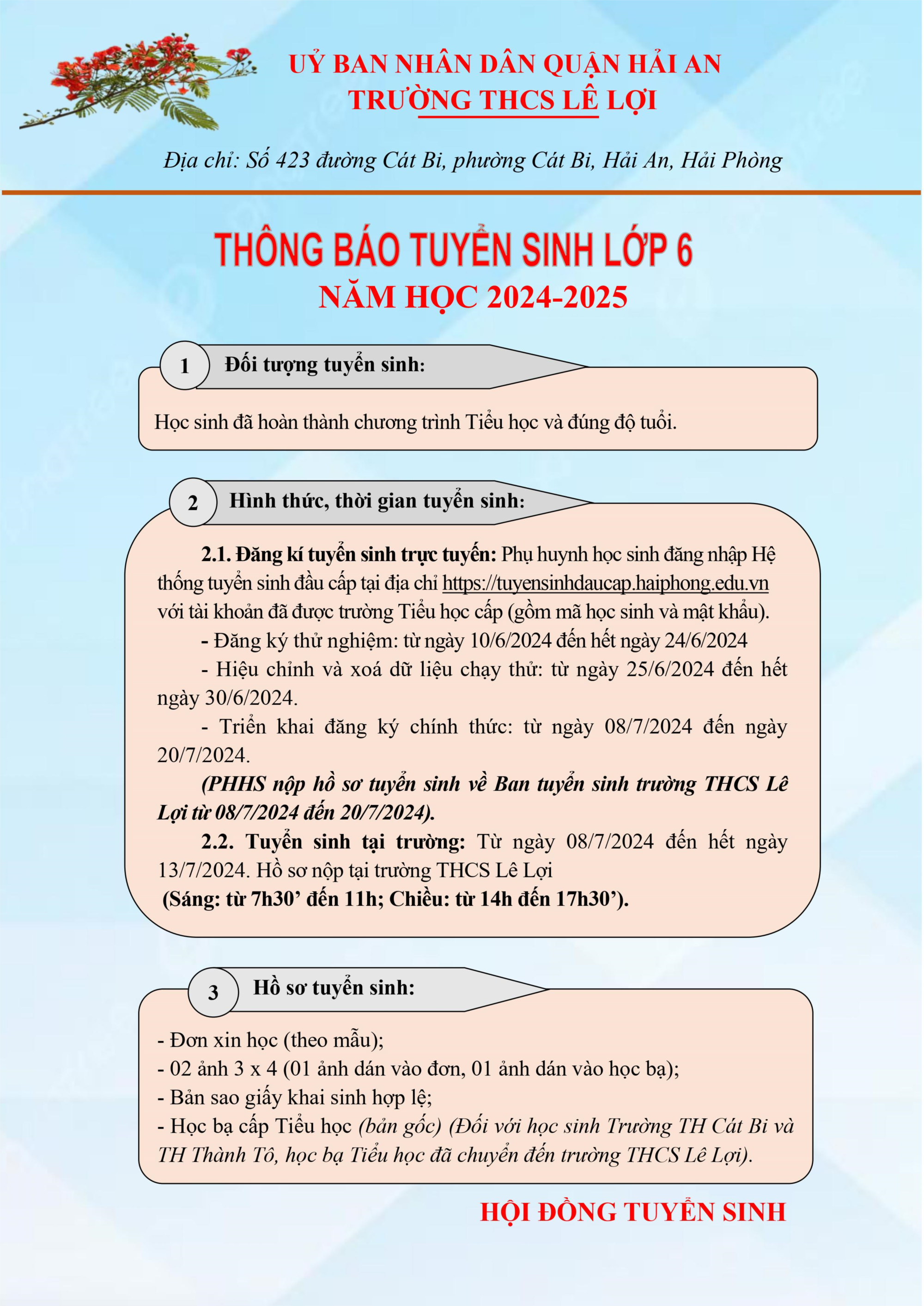 Trường THCS Lê Lợi thông báo tuyển sinh lớp 6 năm học 2024-2025