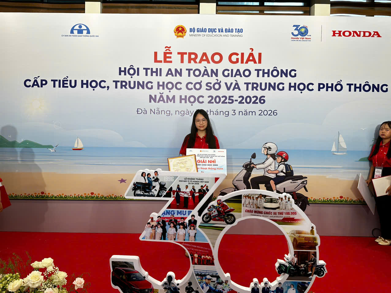 🌟 Trường THCS Lê Lợi vinh danh và chúc mừng em Trịnh Thanh Bảo Trân – học sinh lớp 8B6 do cô giáo Lê Thị Thu hướng dẫn đã xuất sắc đạt Giải Nhì cấp Quốc gia trong Cuộc thi An toàn giao thông cho nụ cười ngày mai dành cho học sinh Tiểu học, THCS và THPT năm học 2025–2026, được trao giải tại thành phố Đà Nẵng.