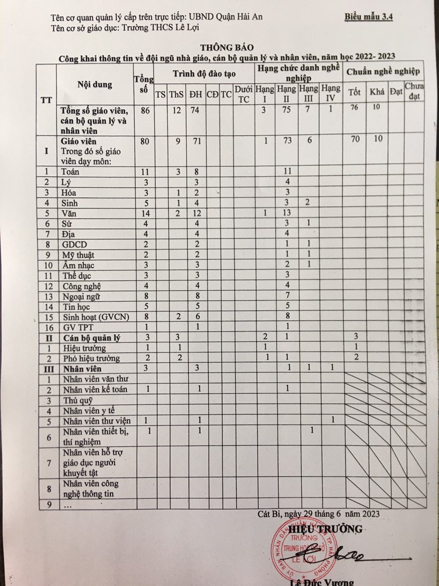 Thông báo công khai thông tin về đội ngũ nhà giáo, cán bộ quản lý và nhân viên năm học 2022-2023