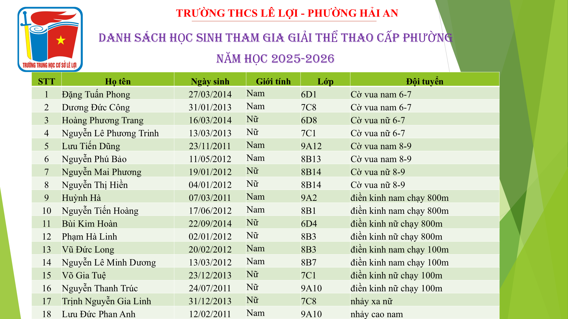 Trường thcs lê lợi tổ chức sơ kết học kì i năm học 2025 - 2026 và khen thưởng học sinh có thành tích xuất sắc  |  Đội tuyển tham gia kỳ thi chọn HSG cấp Thành phố Trường THCS Lê Lợi dâng hương tại Từ Lương Xâm-Đại bản doanh của Đức Vương Ngô Quyền  |  Lễ chào cờ tháng 01 năm 2026  |  Học sinh Trường THCS Lê Lợi tham gia cuộc thi nghiên cứu KHKT cấp Thành phố dành cho học sinh trung học năm học 2025-2026.  |  Trường THCS Lê Lợi tiếp xúc học sinh và phụ huynh học sinh có con tham gia kỳ thi chọn học sinh giỏi các môn văn hóa lớp 9 và cuộc thi KHKT cấp Thành phố năm học 2025-2026  |  Quyết định về việc lựa chọn bộ sách giáo khoa "Kết nối tri thức với cuộc sống" sử dụng thống nhất toàn quốc từ năm học 2026-2027  |  Trường THCS Lê Lợi tham gia cuộc thi “Em yêu biển, đảo quê hương”  |  Trường THCS Lê Lợi vinh danh Thủ khoa, Á khoa, Tam khoa kỳ thi khảo sát chất lượng tháng 12 khối 9 năm học 2025-2026  |  Trường THCS Lê Lợi vinh danh học sinh đạt giải các môn thi đấu thể thao phường Hải An năm học 2025 - 2026  |  Trường THCS Lê Lợi vinh danh học sinh đạt giải trong kỳ thi chọn học sinh Giỏi cấp phường các môn Văn hóa lớp 9 Giáo dục THCS năm học 2025-2026