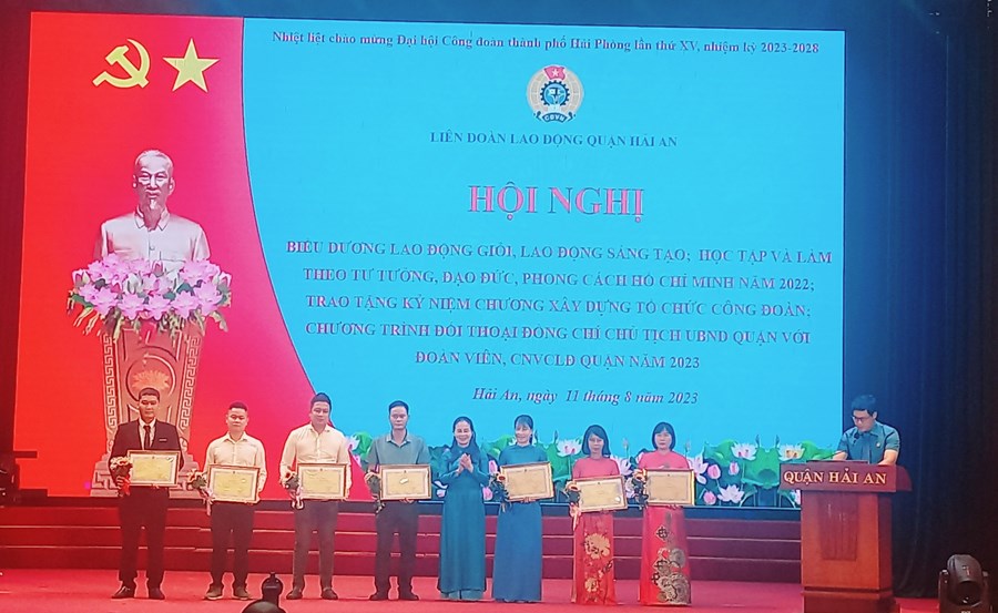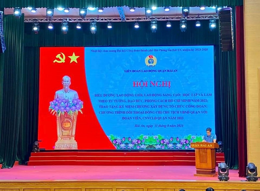 Chiều ngày 11/8, Liên đoàn Lao động Quận Hải An tổ chức Hội nghị biểu dương lao động giỏi, lao động sáng tạo; Học tập và làm theo tư tưởng, đạo đức, phong cách Hồ Chí Minh năm 2022; Trao tặng kỉ niệm chương xây dựng tổ chức công đoàn; Chương trình đối thoại đồng chí Chủ tịch UBND quận với đoàn viên, CNVCLĐ quận năm 2023.
