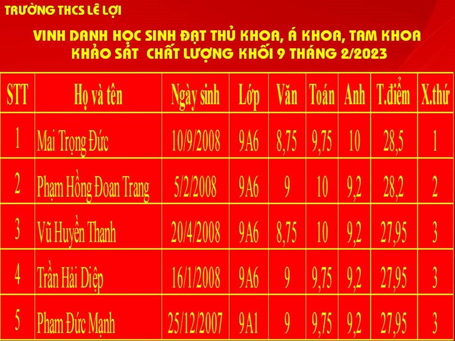 • Danh sách học sinh đạt thủ khoa, Á khoa, Tam khoa kỳ thi khảo sát chất lượng lớp 9 ngày 03/5/2024