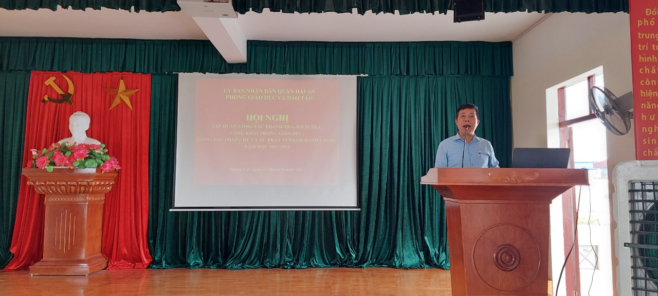 Thực hiện thông báo số 158/TB-PGDĐT ngày 06/9/2022 của Phòng Giáo dục và Đào tạo Hải An về việc tập huấn công tác thanh tra, công khai trong giáo dục, công tác pháp chế và xử phạt vi phạm hành chính. Ngày 7/9/2022, các đồng chí trong Ban Giám hiệu và các đồng chí thuộc diện quy hoạch cán bộ đã tham gia buổi tập huấn. Tham gia buổi tập huấn còn có các đồng chí phòng Thanh tra của Sở GD&ĐT đến chỉ đạo và triển khai các nội dung của buổi tập huấn.