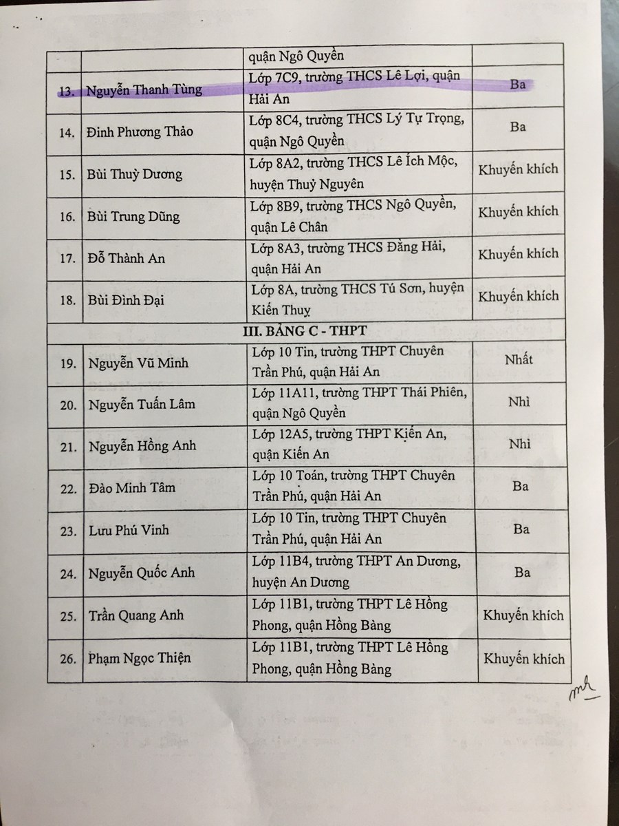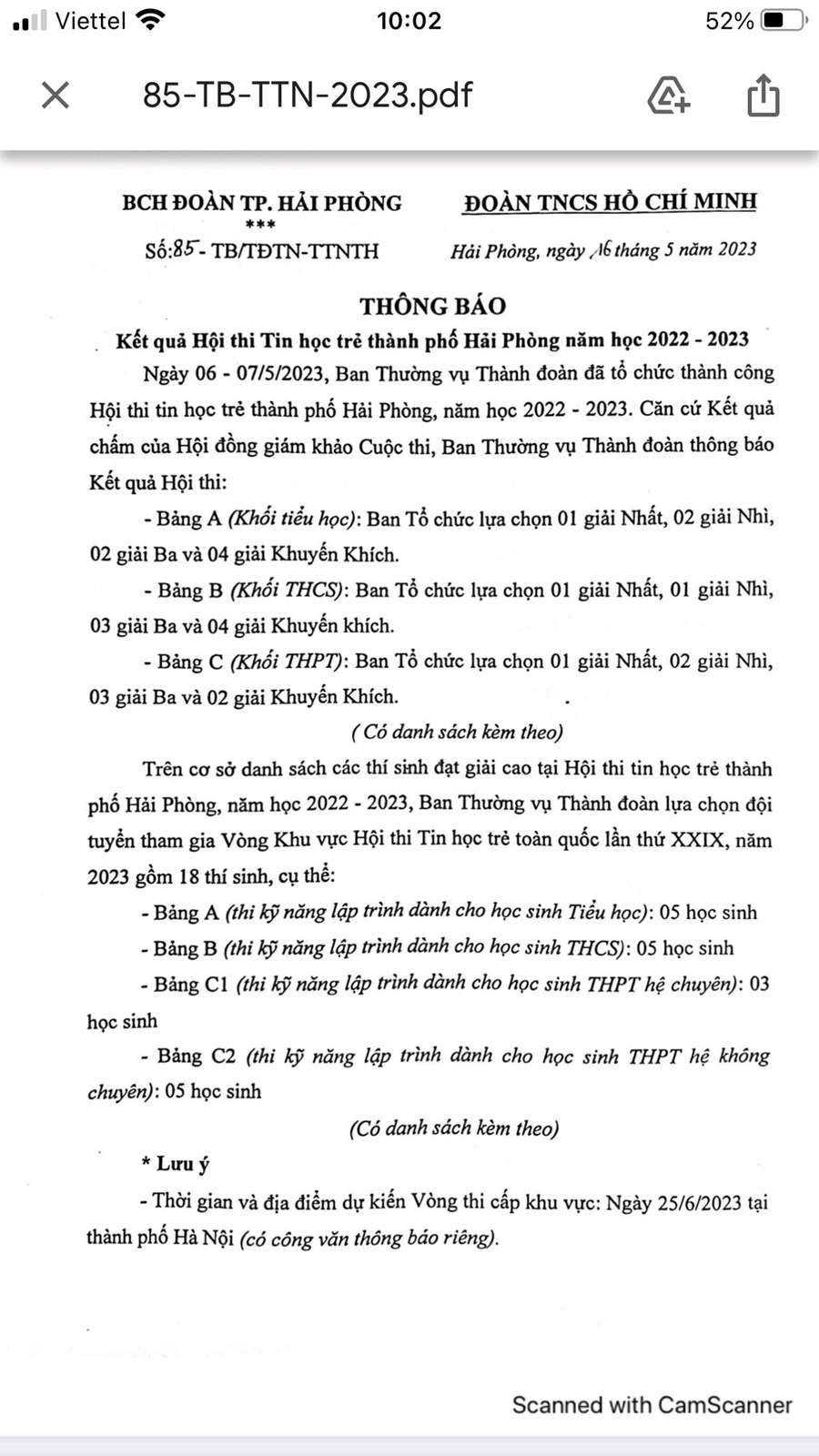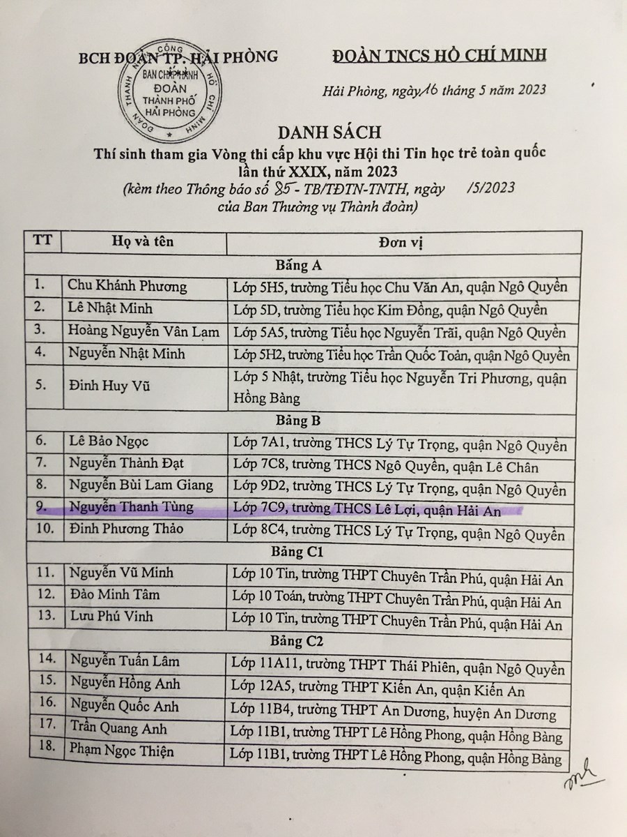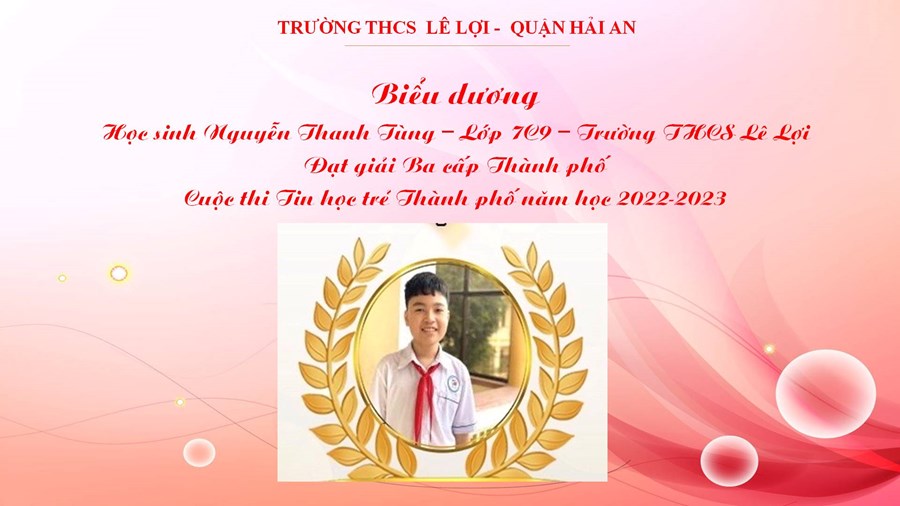 Thực hiện kế hoạch số 41-TB/ĐTN ngày 5/4/2023 của Quận đoàn Hải An về việc tham gia Hội thi Tin học trẻ thành phố Hải Phòng năm học 2022-2023. Trường THCS Lê Lợi có học sinh Nguyễn Thanh Tùng - Lớp 7C9 tham gia Hội thi đạt giải Ba cấp Thành phố và được chọn tham gia Hội thi Tin học trẻ toàn quốc.
