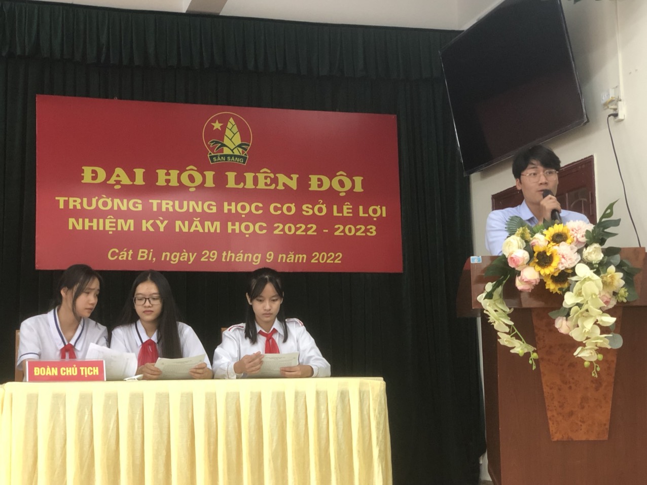 Thực hiện chương trình công tác Đội và phong trào thiếu nhi năm học 2022-2023 của Hội đồng Đội quận Hải An. Chiều ngày 29 tháng 9 năm 2022, trường THCS Lê Lợi đã tiến hành tổ chức Đại hội đại biểu Liên đội THCS Lê Lợi nhiệm kỳ 2022-2023. Đến dự Đại hội Liên đội có đồng chí Phạm Thành Sơn - Phó Bí thư quận Đoàn Hải An, Ban Giám Hiệu nhà trường và các thầy cô giáo trong Chi đoàn giáo viên, các em học sinh trong Ban chấp hành chi đội các lớp. Tại Đại hội đã bầu ra 17 em xuất săc nhất trong Ban chấp hành Liên đội THCS Lê Lợi.