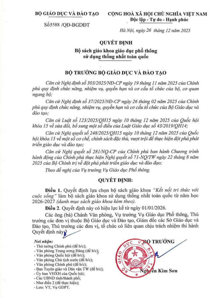 Quyết định về việc lựa chọn bộ sách giáo khoa "Kết nối tri thức với cuộc sống" sử dụng thống nhất toàn quốc từ năm học 2026-2027