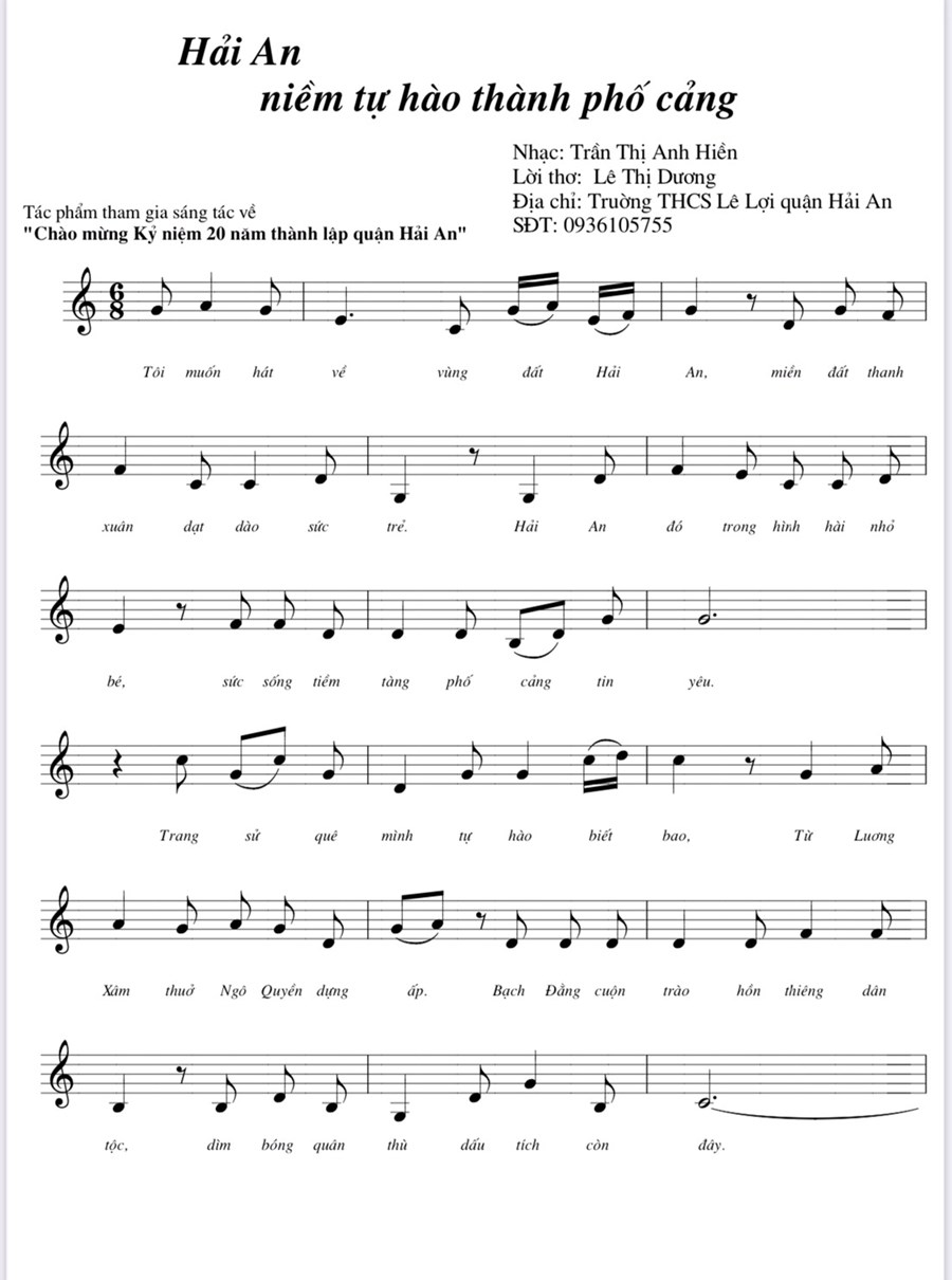 Thực hiện kế hoạch số 141/KH-UBND ngày 17/6/2022 của UBND quận Hải An về việc tổ chức phát động sáng tác nghệ thuật thơ, ca khúc chào mừng kỷ niệm 20 năm ngày thành lập quận Hải An (10/5/2003 - 10/5/2023). Trường THCS Lê Lợi có 4 tác phẩm dự thi gồm 3 bài thơ và 1 ca khúc của các cô giáo Trần Thị Anh Hiền - giáo viên môn Âm nhạc với bài hát "Hải An niềm tự hào thành phố Cảng" , Cô giáo Lê Thị Dương - giáo viên môn Văn với bài thơ "Hát về Hải An", Cô giáo Vương Thị Thanh Xuân - giáo viên môn Văn với 2 bài thơ "Nét đẹp Quận Hải An" và "Tự hào Quận Hải An". Trong đó bài hát "Hải An niềm tự hào thành phố Cảng" Nhạc của cô giáo Trần Thị Anh Hiền và lời thơ cô giáo Lê Thị Dương được dự thi vòng chung khảo.