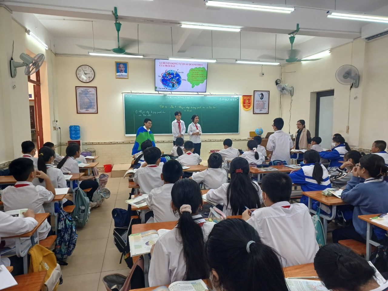 Nhóm học sinh báo cáo phần nghiên cứu hoạt động tự quay quanh trục của Trái Đất hấp dẫn và sáng tạo môn Lịch sử và Địa lý 6 do cô giáo Nguyễn Thị Minh Chi giảng dạy.