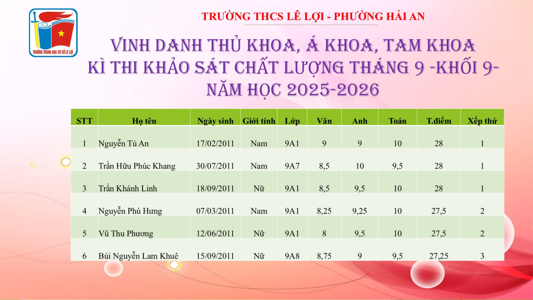 Nhằm đánh giá chất lượng dạy và học cũng như tạo động lực phấn đấu cho học sinh, trường THCS Lê Lợi đã tổ chức kỳ thi khảo sát tháng 9 năm 2025 dành cho các khối 9. Kỳ thi không chỉ phản ánh năng lực học tập của học sinh mà còn là cơ hội để các em khẳng định bản thân, nỗ lực vươn lên trong học tập.