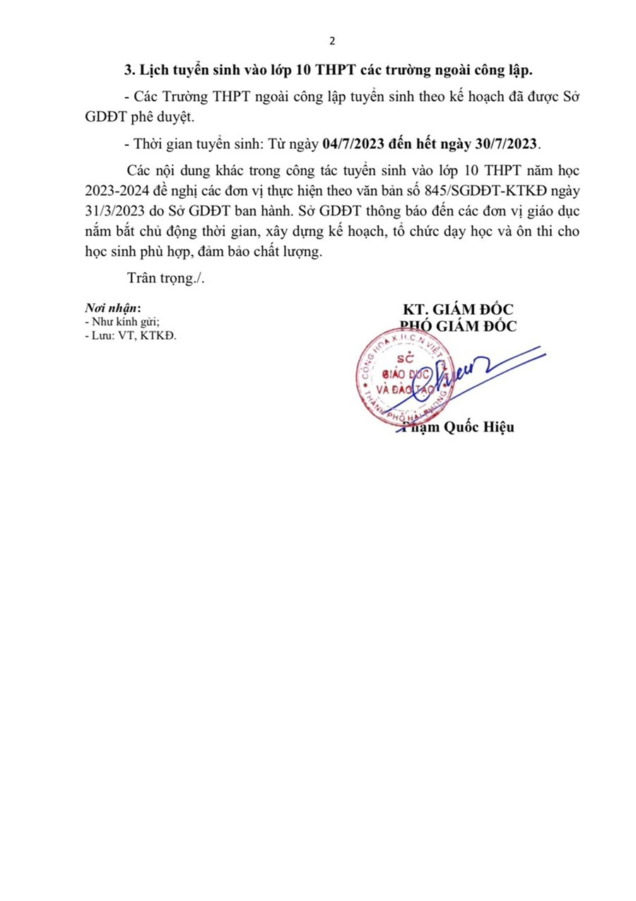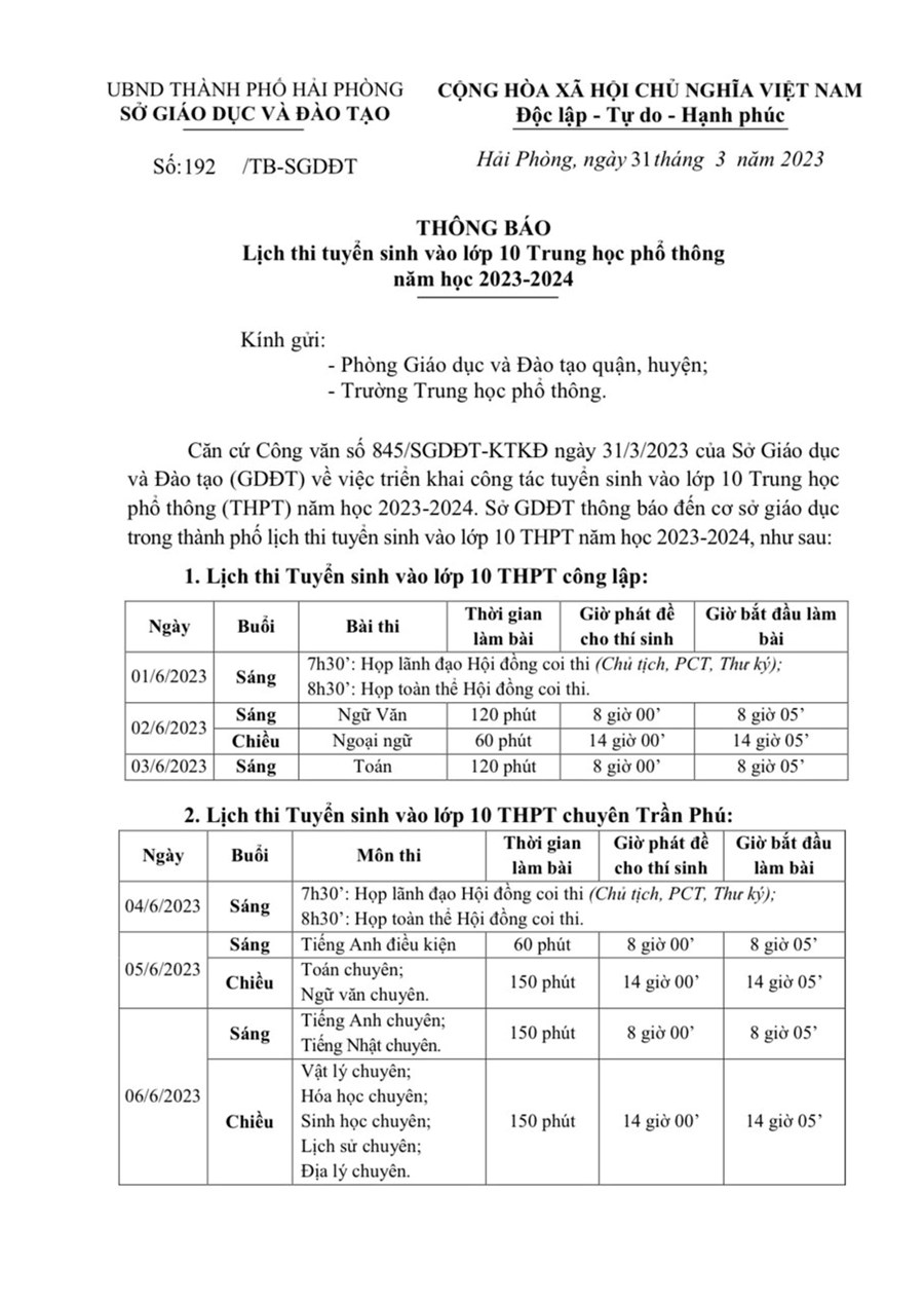 Thông báo Lịch thi tuyển sinh vào lớp 10 THPT năm học 2023-2024